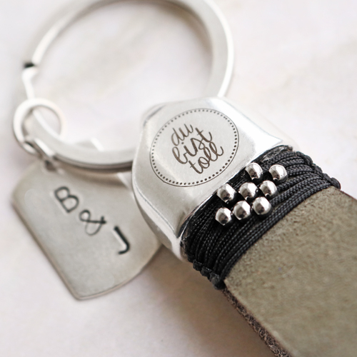 Es hora de dar rienda suelta a tu creatividad con los llaveros DQ Mix&Match. ¡Las posibilidades con esta colección son infinitas! El cordón estilo marítimo también se puede anudar, y se consigue un fantástico efecto. Para hacerlo, debes usar el cordón de 3 metros. Además de alternar cordones, puedes personalizar el llavero con colgantes y la colección ImpressArt. Elige, por ejemplo, un sello con figura ImpressArt y graba con un set de sellos con letra el nombre de tu ciudad, tu lugar de vacaciones favorito o tus iniciales y las de tu persona amada. ¿Prefieres un llavero con un estilo más atrevido? Pues en lugar de cordón estilo marítimo, usa cuero DQ. Puedes utilizar cuero DQ de 10 mm, o combinar varias tiras estrechas de cuero para conseguir un efecto más gracioso. También puedes dar otro aire al cuero y al cordón usando hilo de macramé y cuentas. ¡Buena suerte!