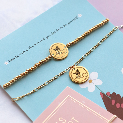 Inspírate y prueba con la colección Girls Support Girls. Dentro de esta colección encontrará colgantes, entrepiezas y tarjetas de joyería en línea con el tema del apoyo a las mujeres. Haz un collar sencillo pero a la moda montando un colgante Girls Support Girls en una cadena Jasseron metálica DQ. Otra gran idea es utilizar una entrepieza para hacer una pulsera hilo macramé. Enfila la entrepieza en el hilo macramé y cierra la pulsera con un nudo corredizo. Colocando la pulsera en la tarjeta de joyería rosa de Girls Support Girls, puedes vender una pieza de joyería ya hecha. Por supuesto, hay muchas otras opciones para hacer pulseras. Por ejemplo, puedes combinar el colgante con cuentas metálicas DQ doradas o cuentas Miyuki. Dale rienda suelta a tu creatividad. ¡Crea joyería inspiradora! Y utiliza las tarjetas de joyería como toque final para un ¡regalo maravilloso!