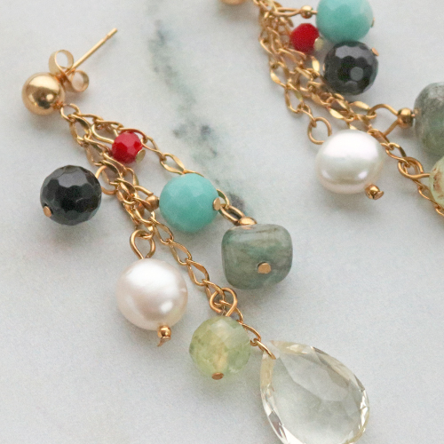 Esta vez nos pusimos creativos con varias clases de abalorios. Para esto combinamos diferentes tipos de cuentas en diferentes tamaños y como resultado obtuvimos una preciosa pieza de joyería con un look súper atractivo. Para crear un bonito collar o pulsera solo tienes que elegir varios tipos de cuentas como perlas de agua dulce, abalorios facetados o piedras naturales e insértelas en el orden deseado sobre el hilo. Para esto utilizamos el hilo 7 de 0.38mm marca Beadalon. Para cerrar la pulsera o el collar puedes usar un cierre de joyería y una chafa. ¿Quieres hacer unos pendientes a juego? Entonces crea múltiples capas con jasseron y pegalas a la fornitura de pendiente. Coge las cuentas que quieras usar y enróscalas sobre un bastón metálico y crea tu propio colgante. ¡Estos colgantes ya pueden ser colocados en el jasseron y tus pendientes de estilo único están ¡listos!