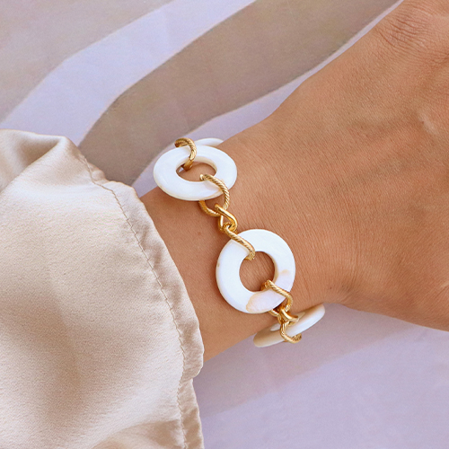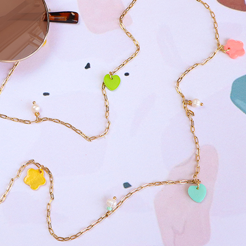 Con nuestra nueva colección de abalorios y colgantes de concha podrás diseñar joyería veraniega y colorida. Convierte las conchas en un elegante cordón para gafas en combinación con hilo de macramé, perlas de agua dulce, cuentas de acero inoxidable y gomas para gafas. Para la creación de collares y pulseras, puedes usar las cadenas jasseron. Las cuentas de concha y los colgantes pueden fijarse directamente al eslabón de la cadena mediante anillas; esta combinación hace que las conchas de colores y los colgantes ¡destaquen aún más!