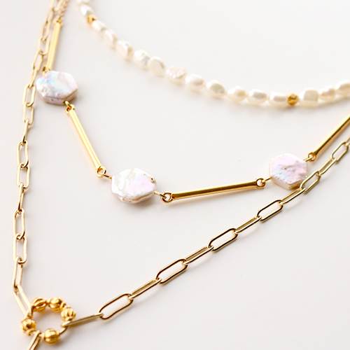 Las perlas seguirán reinando esta temporada, por lo tanto nos hemos puesto muy creativos con la nueva colección y diseñamos elegantes pendientes y diversos collares. Al diseñar varias cadenas de diferentes longitudes se pueden llevar como un conjunto completo en diferentes capas. Los collares los puedes hacer fácilmente con solo enfilar las perlas en el alambre. Otra opción es usar una cadena jasseron y utilizar las perlas como un colgantes o entrepieza. Para esto necesitas usar un bastón metálico con cabeza después anfilas las perlas y en la parte inferior realizas un doblez para crear un anillo para montarlo a tu pieza de joyería. Los abalorios y colgantes metálicos DQ van muy bien con las perlas de agua dulce.