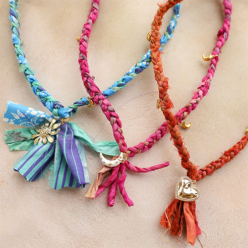 Esta nueva colección de cintas Sari de seda brilla en colores como morado, azul y naranja. Cada cinta está hecha de tela Sari reciclada, lo que hace que cada pieza sea única y sostenible. Utiliza esta cinta para crear collares con colgantes grandes y pequeños, pendientes o pulseras, y añade nuestras nuevas correderas DQ plateadas ¡para un look artesanal y elegante!