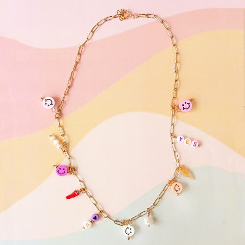 ¿Listo para diseñar joyas súper coloridas y alegres? Entonces, ¡empieza con la nueva colección de abalorios de polímero! Puedes crear estos collares de moda utilizando eslabones gruesos de jasseron, perlas de agua dulce grande, letras acrílicas y diversos colgantes. Los abalorios de polímero son muy coloridos, pero también puedes utilizarlos de forma muy estilizada. Por ejemplo, haz una entrepieza con perlas de agua dulce y una cuenta de polímero. Para ello, se puede utilizar un bastón metálico o fijar un trozo de alambre metálico a ambos lados de la cadena Jasseron. Crea una cadena de eslabones a la moda colocando varios colgantes en la joya. ¿Qué te parece un colgante de pimiento rojo? ¡Dale un twist a las cuentas de polímero! Con solo montar un smiley a un bastón metálico creas en un santiamén un colgante. Diviértete con estos alegres artículos y ¡Echa a volar tu imaginación, ya que las posibilidades son infinitas con los abalorios polímero!
