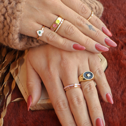 Estos coloridos anillos y pendientes de latón quedan muy bien en cualquier set de joyería. El brillo del color viene dado por la capa de esmalte, mientras que el brillo de la joya procede de la bella zirconia. Combínalos entre sí o con anillos de bricolaje hechos con rocallas o cuentas facetadas.