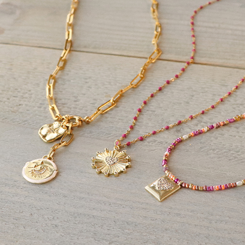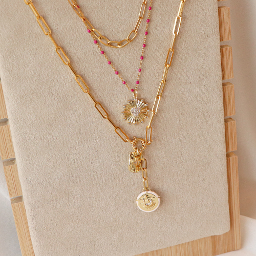 Estos colgantes de latón dorado quedan muy bien cuando se combinan con una cadena jasseron. Crea un lindo collar con cierre reasa marinera con tu cadena favorita. Puedes llevarlo en la parte delantera y colocar uno o varios colgantes. También puede hacer 3 collares de diferentes longitudes: 1 con jasseron, 1 con cuentas de vidrio rocallas y 1 con jasseron de acero inoxidable de colores. Cuelga tus colgantes en las cadenas y tendrás un set muy original. Otra opción es utilizar diferentes tipos de pendientes criolla/aro para fijar tus dijes.