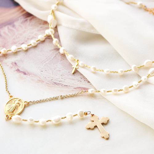 Esta vez hemos fusionado símbolos religiosos con las piezas de bisutería para crear una joyería religiosa de tendencia para ocasiones especiales como el bautismo, la primera comunión, la confirmación o el matrimonio. O simplemente para completar tu outfit con esta propuesta tan original. Para inspirarte, hemos diseñado un set de joyería con ayuda de colgantes metálicos DQ dorados y hermosas perlas de agua dulce para dar un efecto muy chic.También puedes utilizar estas fornituras para el diseño de collares estilo rosarios o pulseras con colgantes religiosos.