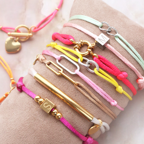¡Es hora de un nuevo set de inspiración! Por eso nos pusimos a trabajar con hilo de satén y conectores de acero inoxidable, para hacer pulseras de moda. Empieza por elegir tu color favorito de hilo de satén. A continuación, haz un lazo con el hilo de satén en ambos lados a través de la entrepieza. Para garantizar que la pieza central se mantenga en su sitio, puedes colocar un abalorio de acero inoxidable en el hilo por ambos lados. Después, cierra la pulsera con un nudo corredizo. También puede utilizar un cierre de anilla y perno para alternar los tipos de cierre. Las pulseras son fáciles de montar de varias maneras, incluyendo componentes de acero inoxidable como cuentas, colgantes y abalorios acrílicos. Para resaltar la belleza de estas creaciones combina con una pulsera de rocallas y perlas de agua dulce y una pulsera de cadena Jasseron. ¡El resultado te encantará!