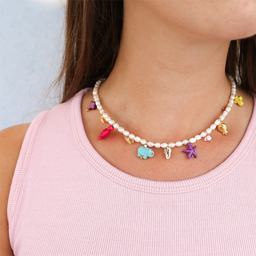 Esta nueva línea de abalorios de piedra natural howlita está disponible en varios tamaños y formas y en bellos colores. Las cuentas son perfectas para crear pulseras, collares u otras joyas para la playa. Divinas para combinar con cadena jasseron y perlas de agua dulce.