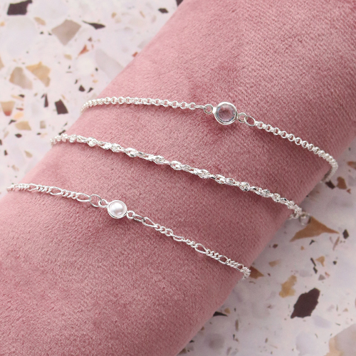 Esta vez hemos reunido diferentes tendencias y las hemos expresado en espectaculares diseños de pulseras, collares y pendientes. Esto con ayuda de cadena jasseron, colgantes de cristal y colgantes de perlas. También sugerimos combinar la cadena jasseron con un práctico mosquetón metálico DQ y decorar con un divertido colgante metálico DQ. Otra opción, es utilizar el el jasseron en combinación con una entrepieza y decorar con un colgantes para hacer una linda pulsera.