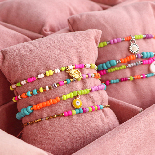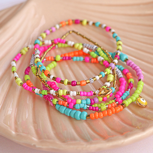 ¡Esta serie de abalorios de cristal rocallas es muy popular debido a los bonitos colores neón que están de súper moda este verano! Con hilo elástico y pegamento para joyería, puedes confeccionar preciosas pulseras. Para esto, usa las cuentas rocalla de diferentes tamaños y combínalas con abalorios hematita para conseguir un collar muy original. Para el cordón de las gafas de sol, puedes utilizar el maravilloso hilo de macramé. Enfila las cuentas en un hilo y, a continuación, enrosca varios hilos entre sí hasta alcanzar la longitud deseada.