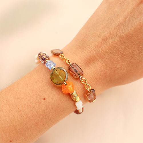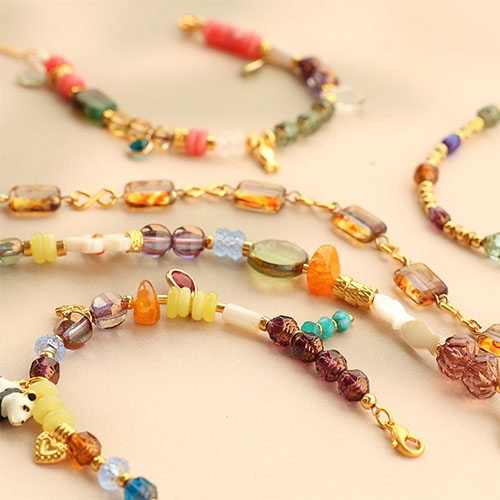 Una colección brillante en diversas formas, tamaños y colores. Perfecta para crear pulseras coloridas que destaquen con estilo. Estos abalorios se fabrican presionando vidrio líquido en moldes metálicos y luego se pulen cuidadosamente, dando como resultado cuentas lisas con carácter, desde diseños sencillos y modernos hasta detalles refinados y elaborados.