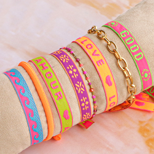 Gracias a esta cinta con texto en colores neón, podrás crear fácilmente una colección de pulseras de gran tendencia. Elige tu cinta favorita y córtala a la longitud adecuada. Puedes cerrar las pulseras de diferentes maneras: con un abalorio de cierre deslizante en acero inoxidable o, por ejemplo, con un abalorio acrílico de letras. Al utilizar un abalorio acrílico de letras añades un ¡toque personal a tu pulsera!