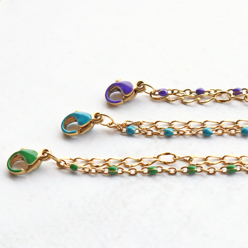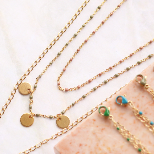 ¿Quieres crear joyas de alta calidad, con un aspecto elegante y un pequeño toque de color? Pues ponte manos a la obra con los nuevos Jasseron de acero inoxidable y mosquetones con detalles de color al óleo. Estos artículos combinan perfectamente y te permiten crear preciosos brazaletes y collares. Intenta también combinar el Jasseron con detalles al óleo con otros modelos de Jasseron, consiguiendo un look desenfadado. Por ejemplo, haz una pulsera o collar de dos capas. Para hacerlo, hay que fijar las dos capas al mismo mosquetón para combinarlas en un único producto. Como toque final puedes añadir un colgante de acero inoxidable al mosquetón, o poner varios amuletos en una anilla en el centro del collar.