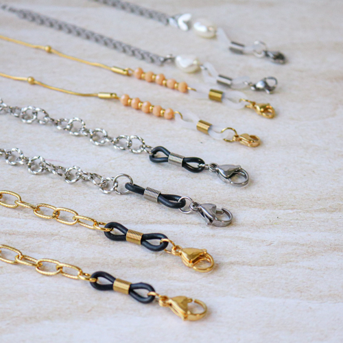 Con la nueva colección de fornituras de joyería en acero inoxidable, ¡podrás hacer las creaciones más chulas! En este set de inspiración, hemos trabajado los acabados de diferentes maneras. Hemos hecho varias pulseras con la popular cadena Jasseron de acero inoxidable. Utilizando anillas, puedes añadir un toque lúdico colgando una concha Cauri, borlas o abalorios letras. Cada pulsera está bellamente terminada con una cadena de extensión de acero inoxidable. Además, las nuevas gomas ajustables para gafas son perfectas para crear originales cordones para las gafas de sol, o para hacer una cadena para tu mascarilla. Puedes hacer fácilmente tus propios cordones/ cadenas para gafas utilizando tu cadena Jasseron favorita como base. También puede utilizar cuentas facetadas, de acero inoxidable o perlas de agua dulce en combinación con los bastones metálicos, terminales y anillas para crear un look único. ¡Buena suerte!