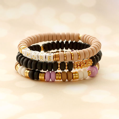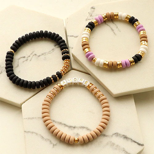¿Buscas bonitos abalorios de colores para tu próxima colección de joyería? Entonces descubre estos nuevos abalorios rondeles de polímero y déjate inspirar. Haz un juego de pulseras con cuentas de polímero de varios colores que combinarás con rondeles de disco metálicos DQ, entrepiezas metálicas DQ y enfila todas las cuentas en hilo elástico. Utiliza alambre metálico y chafas para crear un collar a juego y ¡tu set de joyería estará completo!